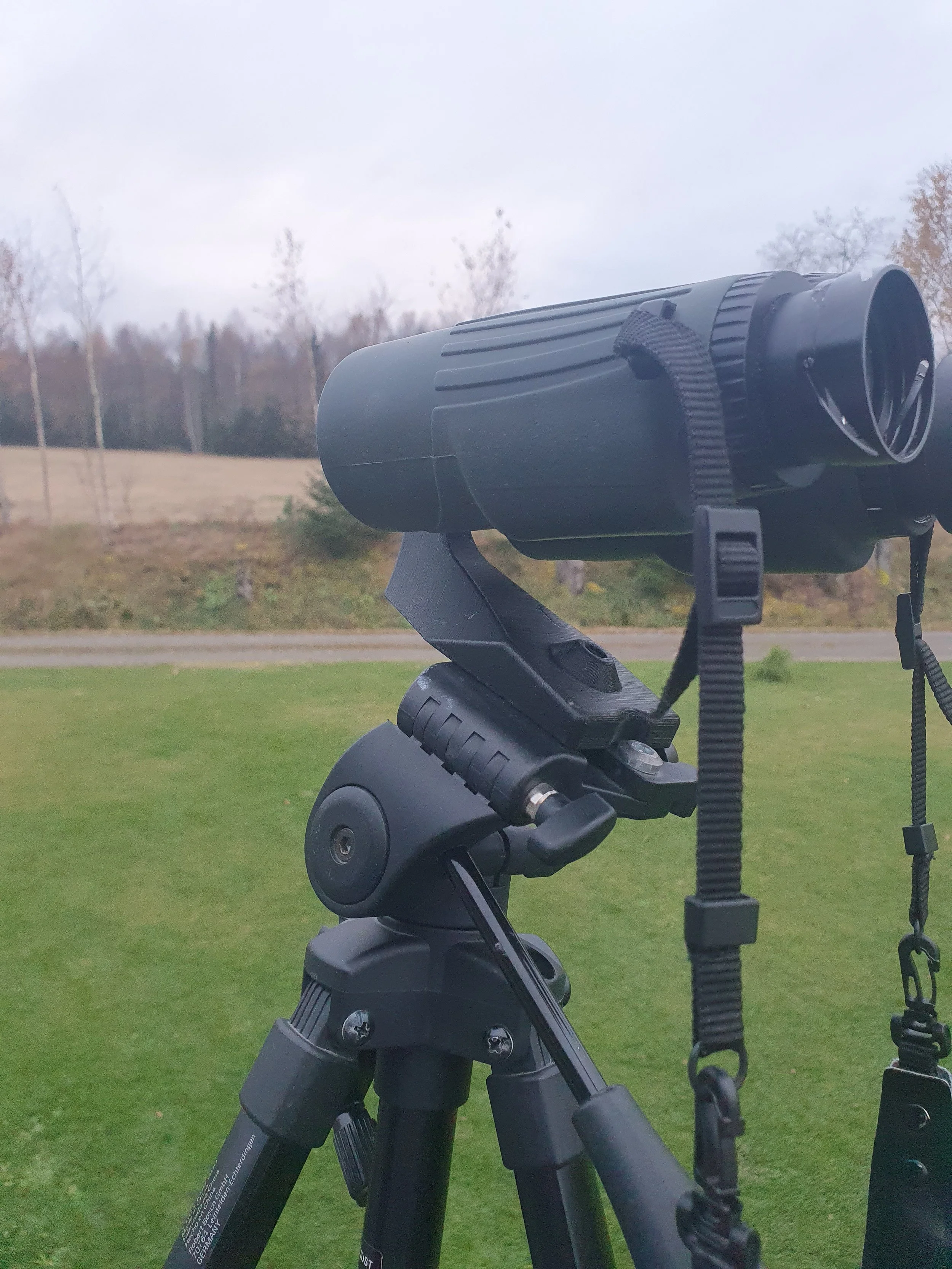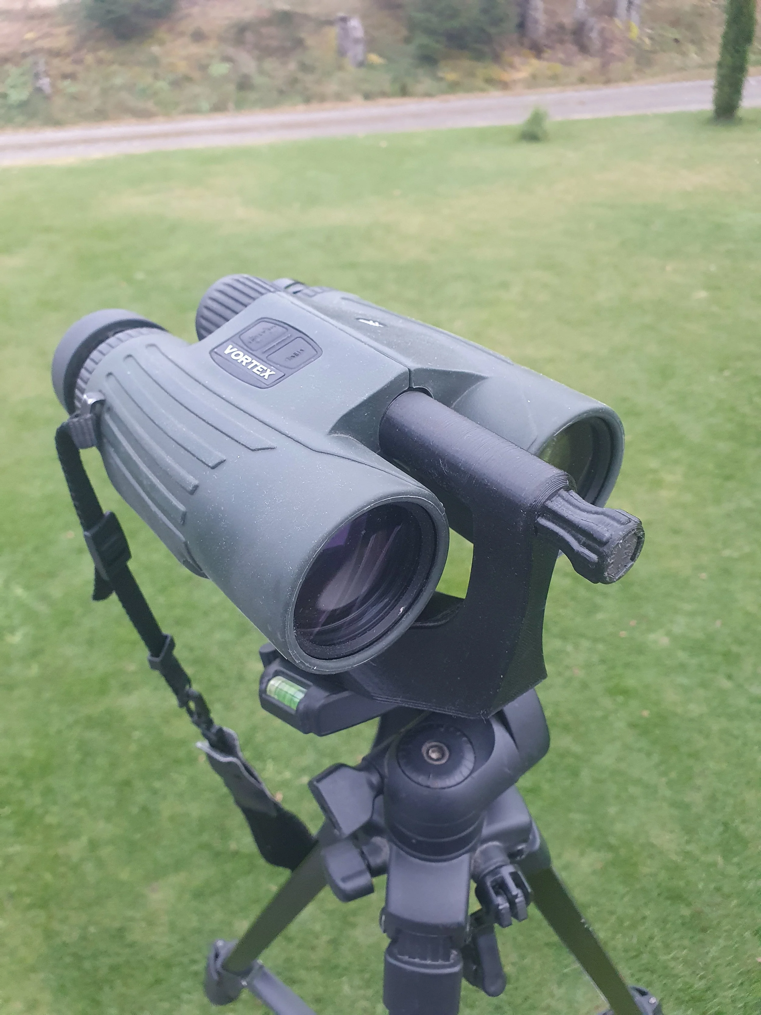 Ved hjelp av 3 separate deler har man her laget en holder som gjør det mulig å montere en håndkikkert på et kamerastativ.